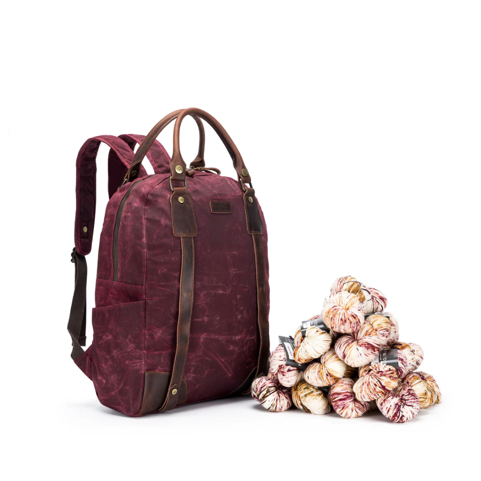 - Two exterior side pockets, two interior snap pockets for electronics, yarn feeder, and yarn cutter
