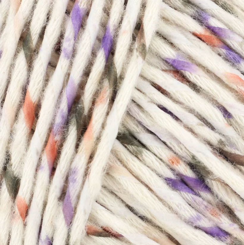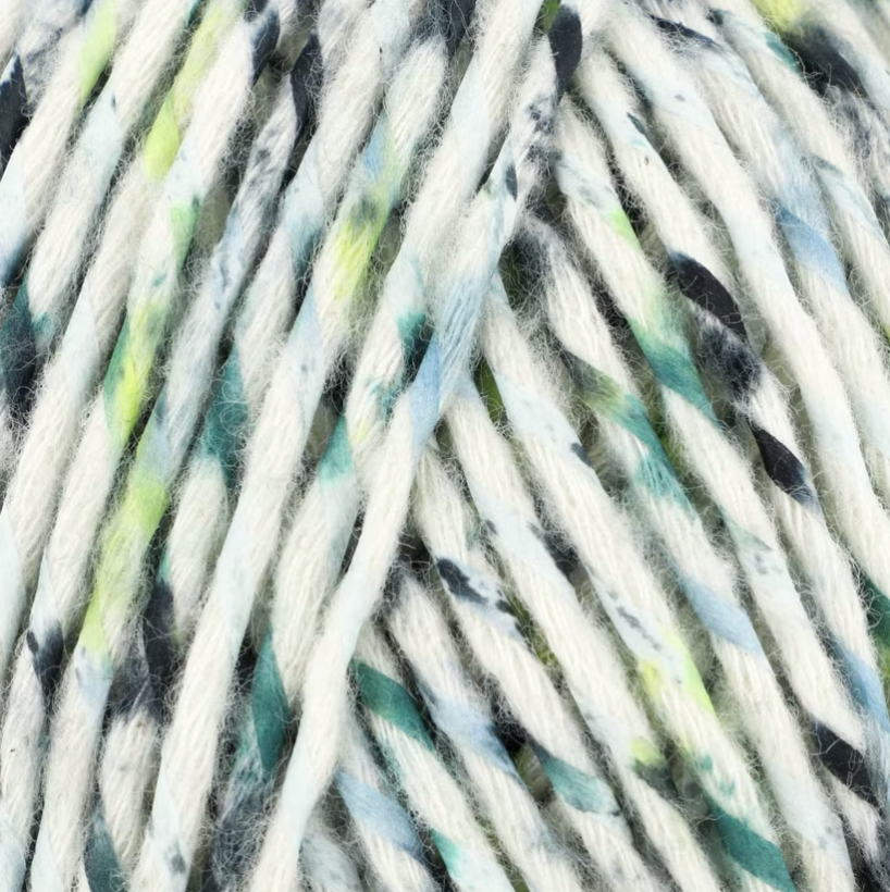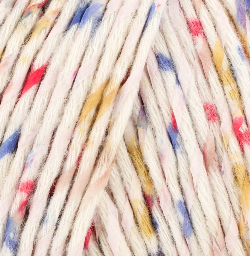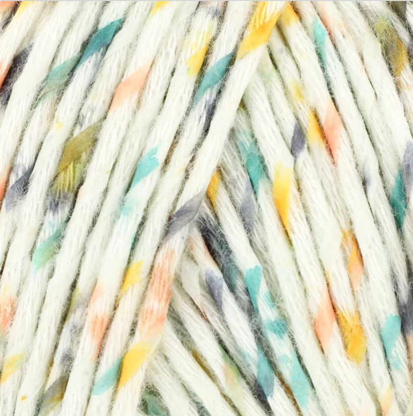 This cotton yarn is wrapped with colorful strips of washable paper. (Yes—you read that right!). The result is a soft-to-the-touch fabric with a kaleidoscope of color evenly dappled throughout the garment.