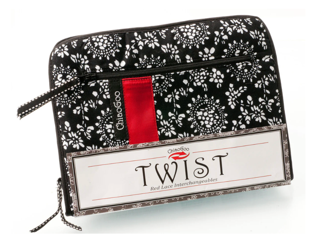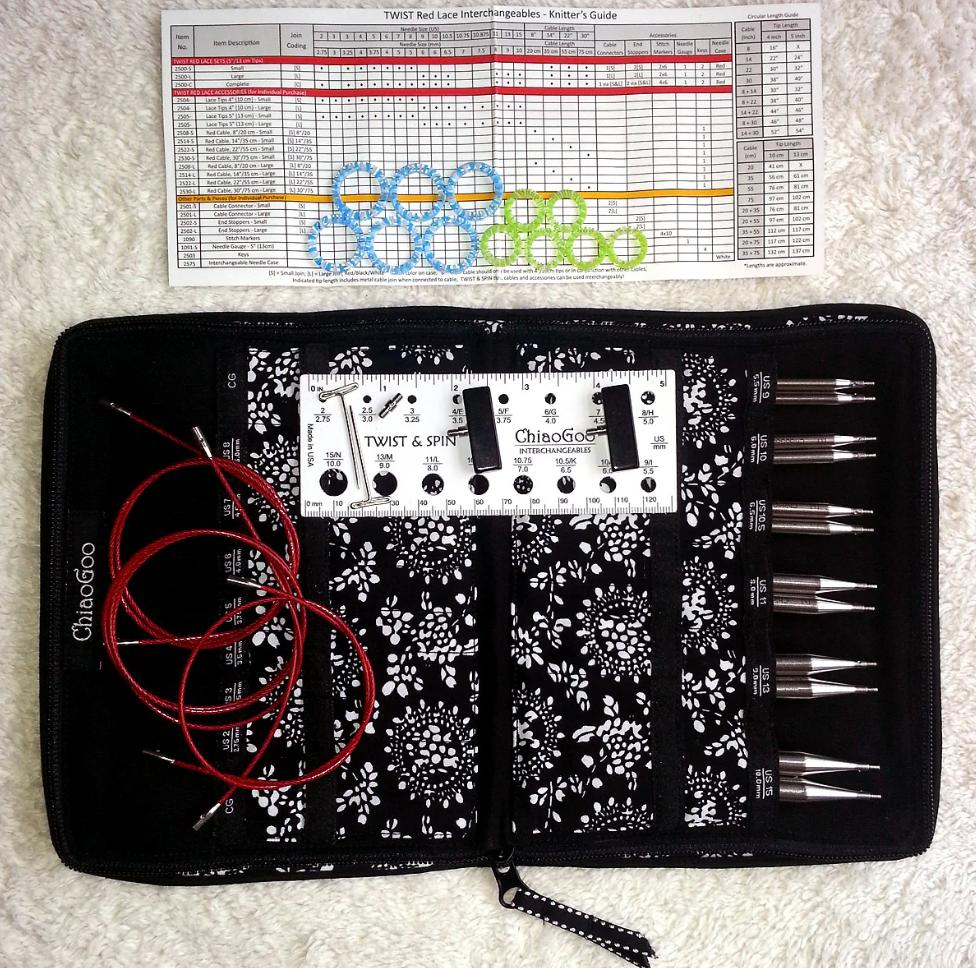 The ChiaoGoo TWIST interchangeable sets feature the same stainless steel Red Lace needles and cables that you know and love. The needle tips feature a lifeline hole that makes adding a lifeline as simple as knitting across the row. TWIST red cables are memory free! They consist of a multi-strand, steel cable coated with red nylon. The sets come packaged in an elegant black and white case with a red ribbon. The case is compact (6-inch x 8-inch closed) with 29 inner pockets for tips and one outside zippered pocket. The ChiaoGoo TWIST 5-Inch Large Set is a great product and an even better value - here is what you'll find inside:
