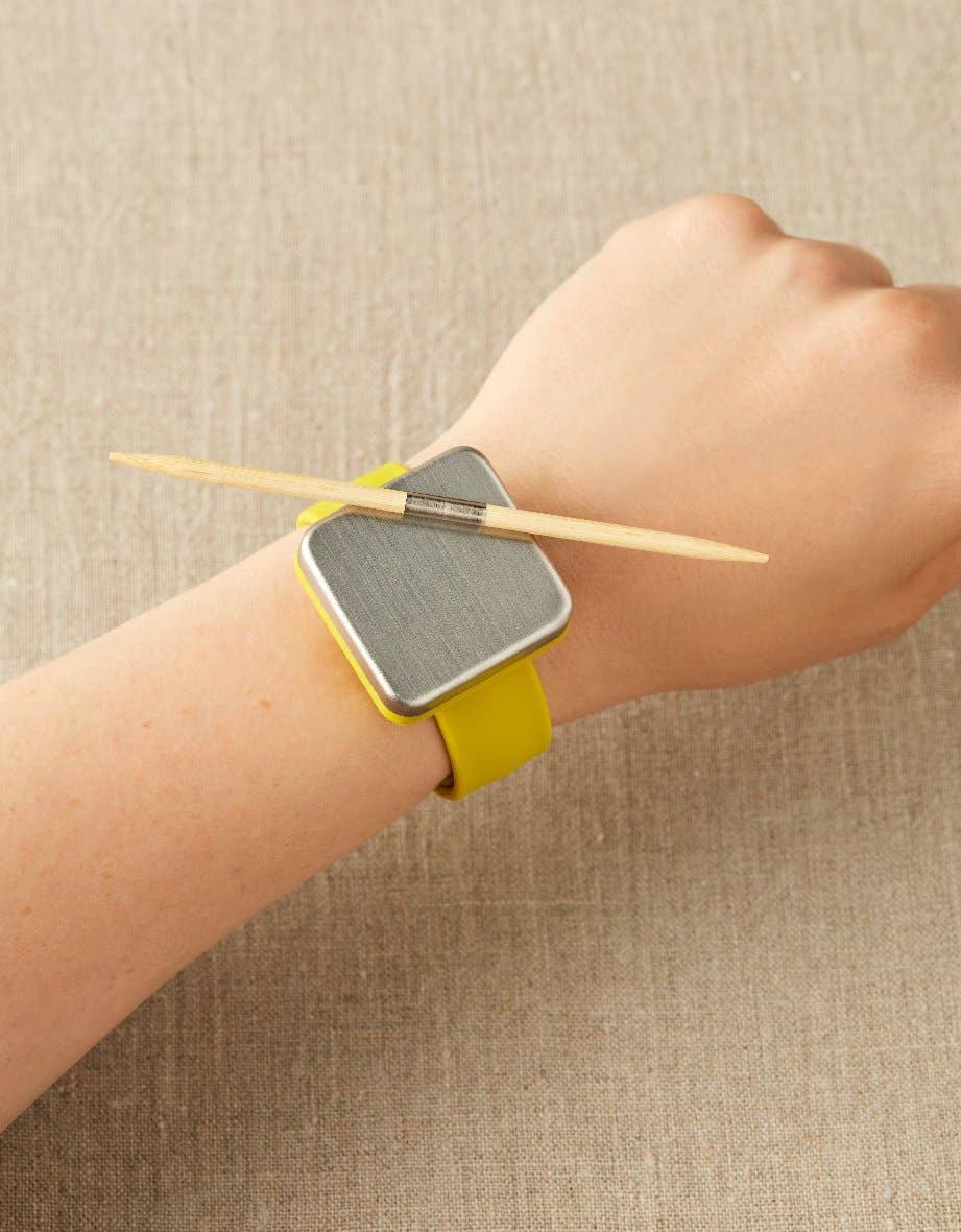Bamboo cable needles with metal band that clings to magnets. US 2/2.75mm US 4/3.5 mm US 6/4 mm US 9/5.5 mm US 10.75/6.75 mm -bamboo and nickel plated steel so they stick to magnets -Blunt ends for customizable sharpness -Needles can be used to work cables in any knitting project. -The small needles are also handy for picking up stitches when using the Cocoknits Method of sweater construction. -When not in use, place them on your Maker's Keep magnetic bracelet – the smooth nickel-plated steel band is designed to cling to any magnet.